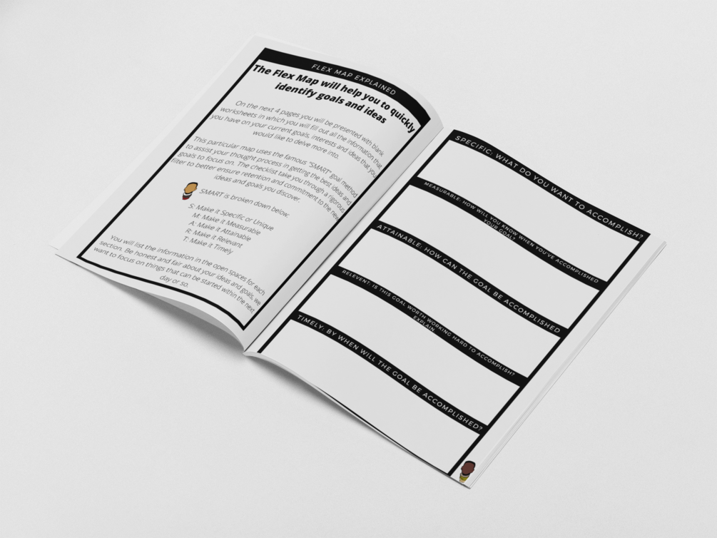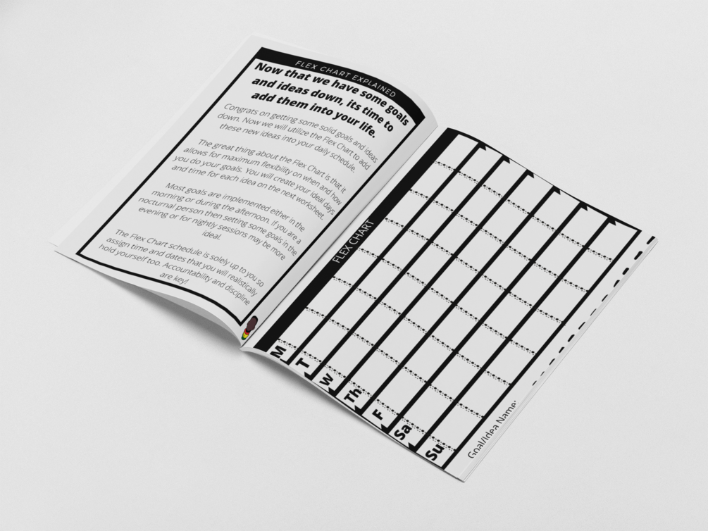 Goal planning workbook complete with charts and maps to assist you in discovering new ideas and concepts. Find your motivation and unlock your inner "Flex"